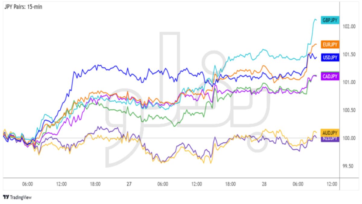 - ین به پایینترین سطح روزانه خود رسید، به ویژه در برابر یورو و پوند، زیرا بازده اوراق قرضه اروپا بر اساس مجموعه دیگری از دادههای خوشبینانه افزایش یافت.